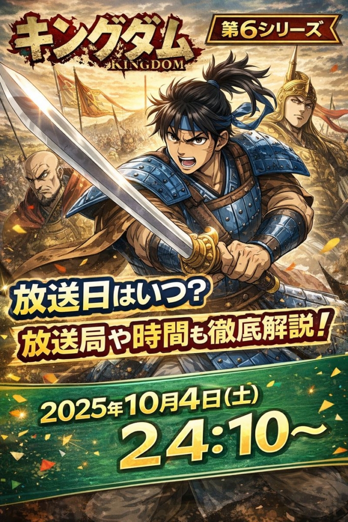 大人気アニメ『キングダム』の第6シリーズがいよいよ始動します。 この記事では、キングダム第6シリーズの放送日や放送局、放送時間など、視聴に必要な基本情報をわかりやすく解説します。 リアルタイムで見逃さないために、放送スケジュールを今のうちに...