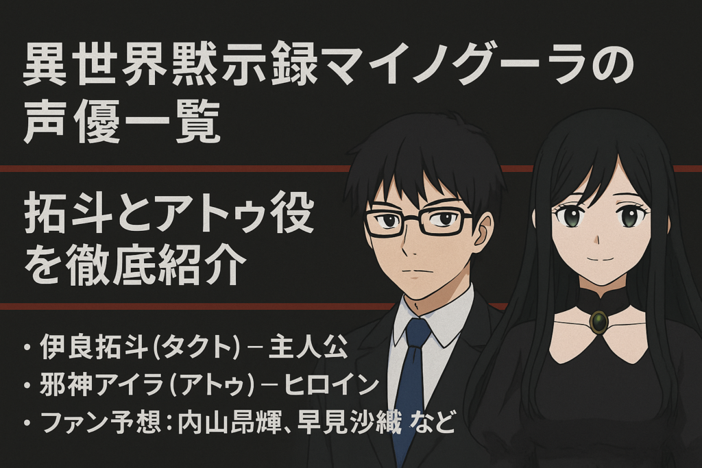 2025年放送の注目アニメ「異世界黙示録マイノグーラ」。 原作ファンから特に注目されているのが、主人公・伊良拓斗(イラ=タクト)やヒロイン・汚泥のアトゥを演じる声優キャストです。 この記事では、異世界黙示録マイノグーラに登場する主要キャラクタ... -