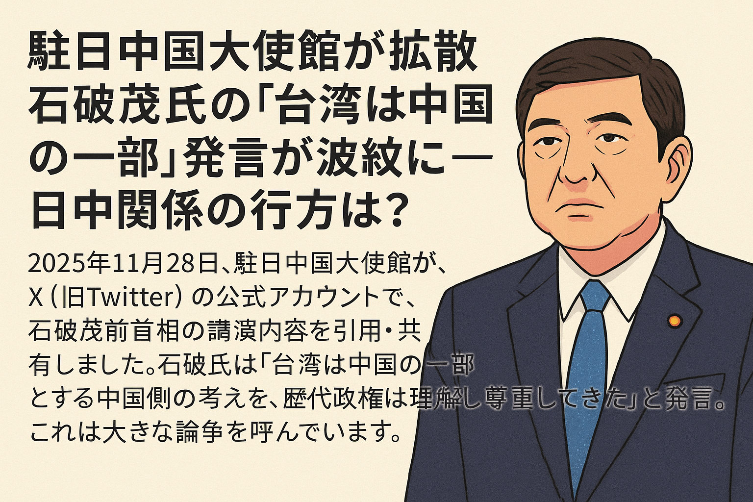 2025年11月28日、駐日中国大使館 が、SNSX(旧Twitter)の公式アカウントで、石破茂前首相の講演内容を引用・共有しました。石破氏は「台湾は中国の一部とする中国側の考えを、歴代政権は理解し尊重してきた」と発言。これは大きな論争を呼んでいます。